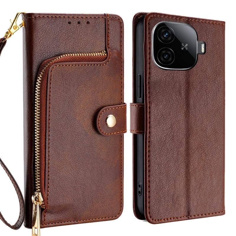 Για vivo iQOO Z9 Turbo φερμουάρ τσάντα δερμάτινη θήκη τηλεφώνου (καφέ)
