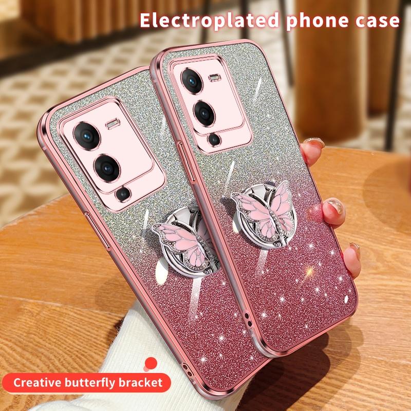 For vivo S15 Plated Gradient Glitter Butterfly Holder TPU Phone Case(Pink)