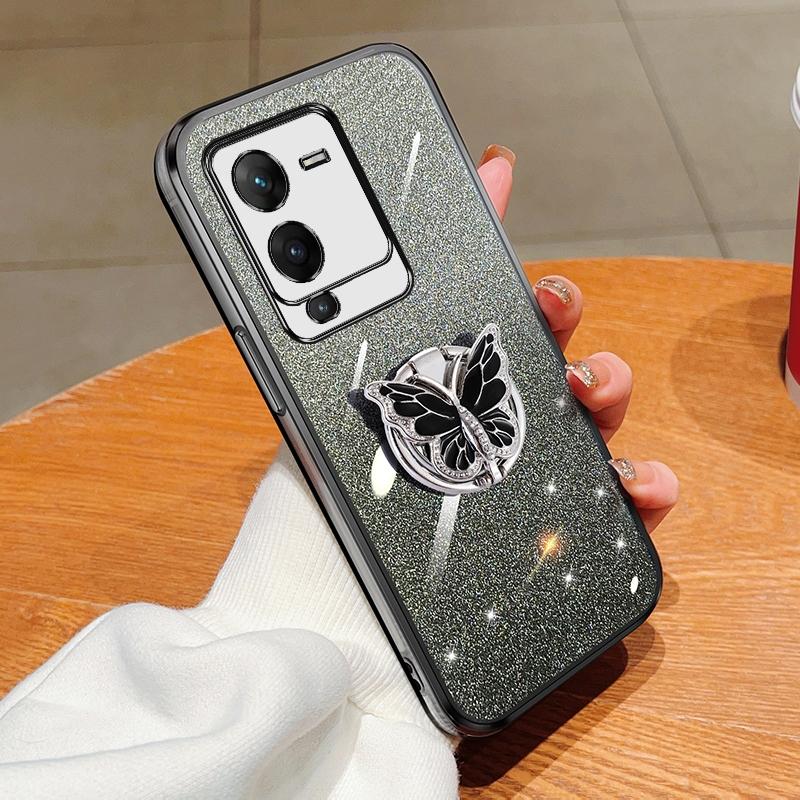 For vivo S15 Pro Plated Gradient Glitter Butterfly Holder TPU Phone Case(Black)