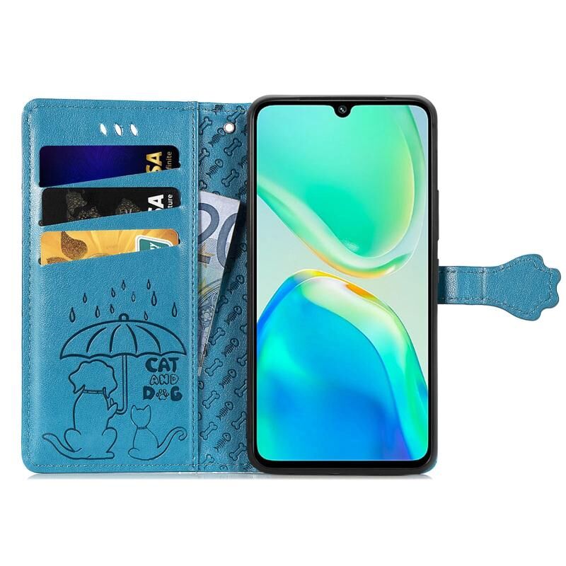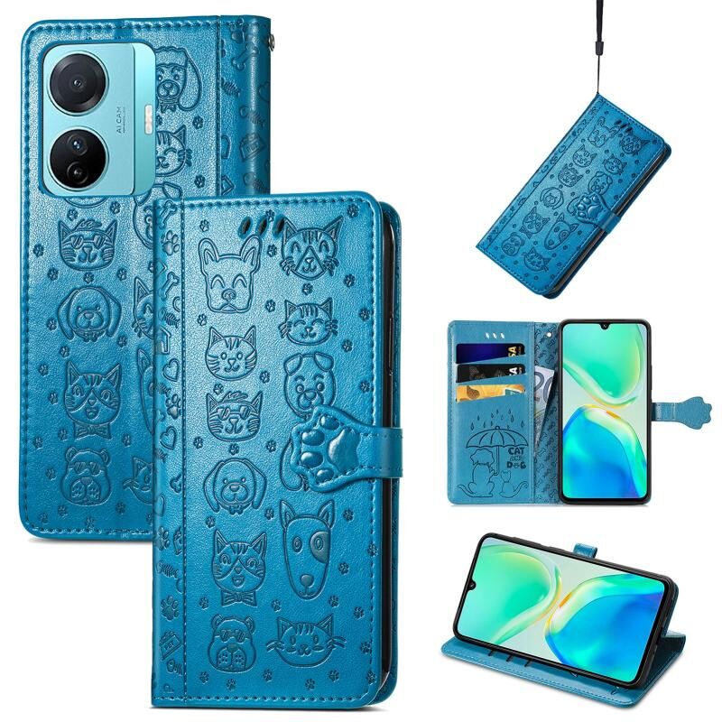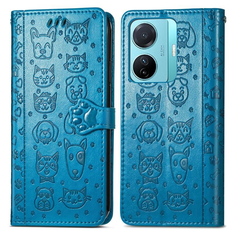 Θήκη τηλεφώνου από δέρμα με ανάγλυφο σχέδιο γάτας και σκύλου για vivo S15e (Μπλε)