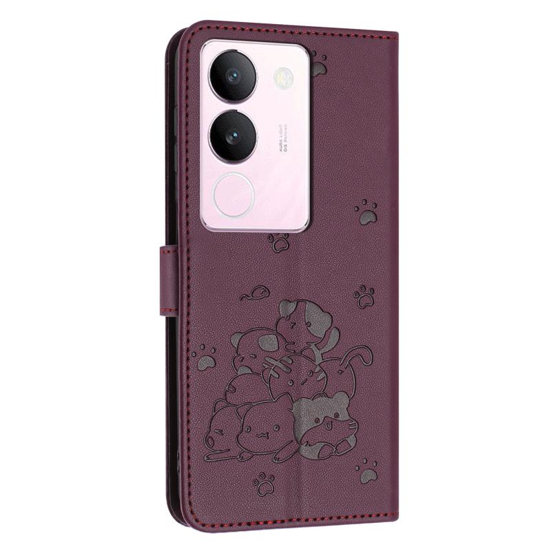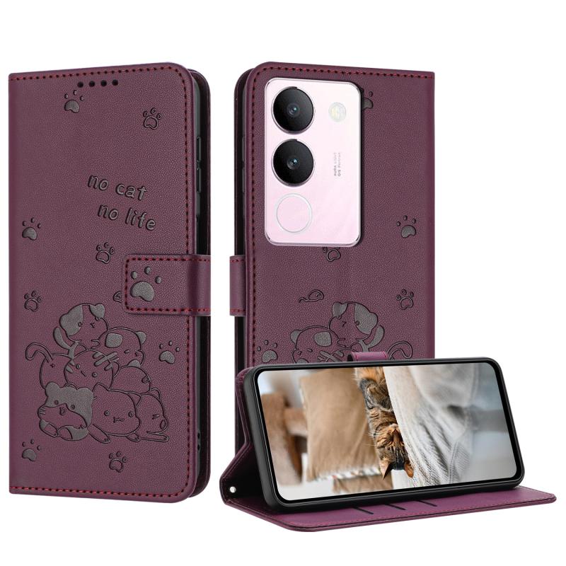 For vivo S17 / S17 Pro / S17t Embossed Kitten Phone Leather Case with Lanyard(Wine Red)