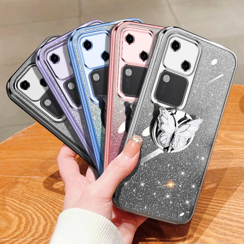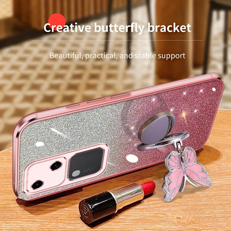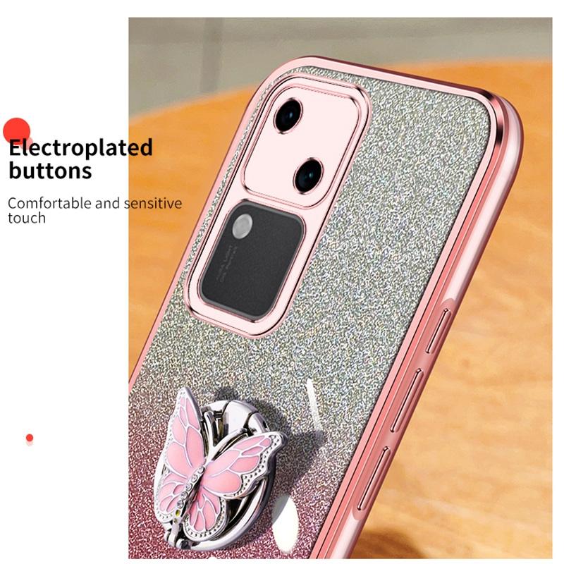 For vivo S18 Plated Gradient Glitter Butterfly Holder TPU Phone Case(Sierra Blue)