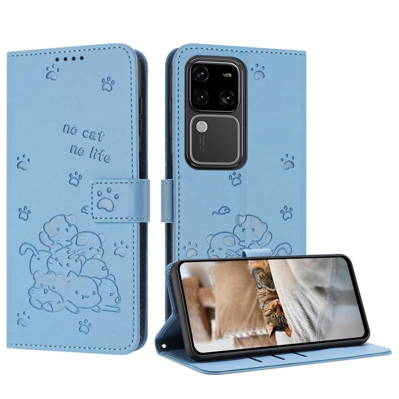 For vivo S18 / S18 Pro Embossed Kitten Phone Leather Case with Lanyard(Blue)