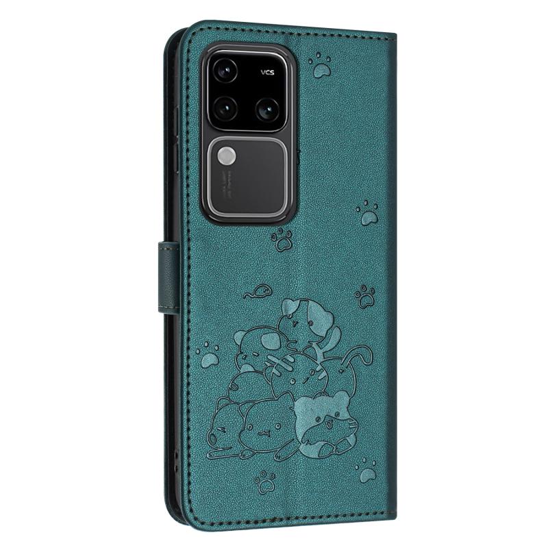 Θήκη δέρματος τηλεφώνου με ανάγλυφο γατάκι και λουρί για vivo S18 / S18 Pro (Σκούρο πράσινο)
