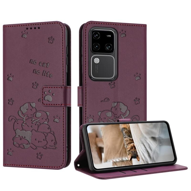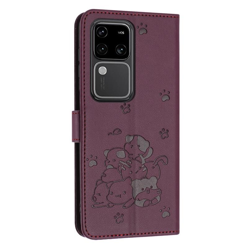 Θήκη δέρματος τηλεφώνου με ανάγλυφο γατάκι και λουρί για vivo S18 / S18 Pro (Κρασοκόκκινο)