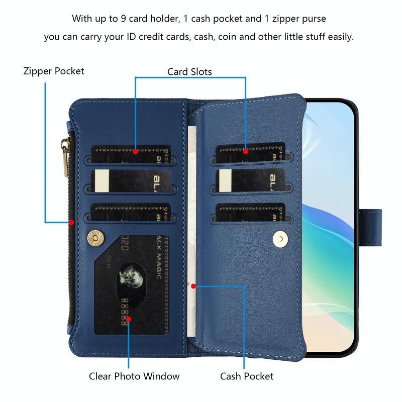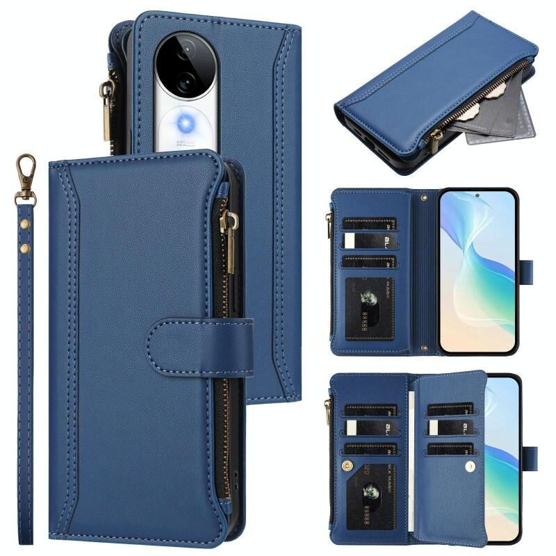 Θήκη δέρματος με μαγνητικό κλείσιμο, 9 θέσεις για κάρτες και φερμουάρ για vivo S19, με λουρί χειρός (Σκούρο Μπλε)