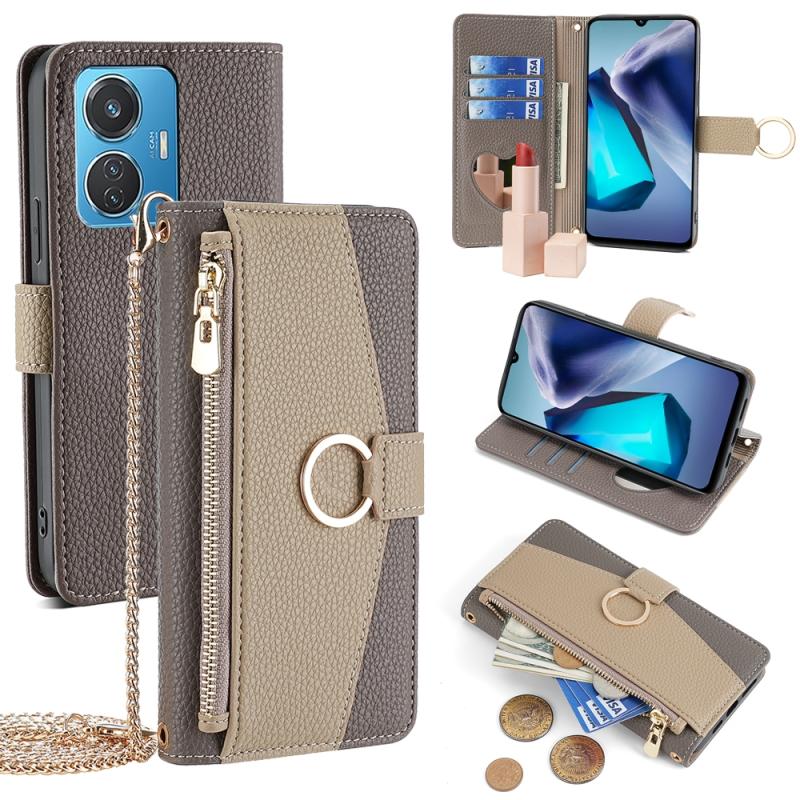 Θήκη τηλεφώνου για vivo T1 4G 44W / iQOO Z6 44W, δερμάτινη με υφή λύτσι, χιαστί (Γκρι)