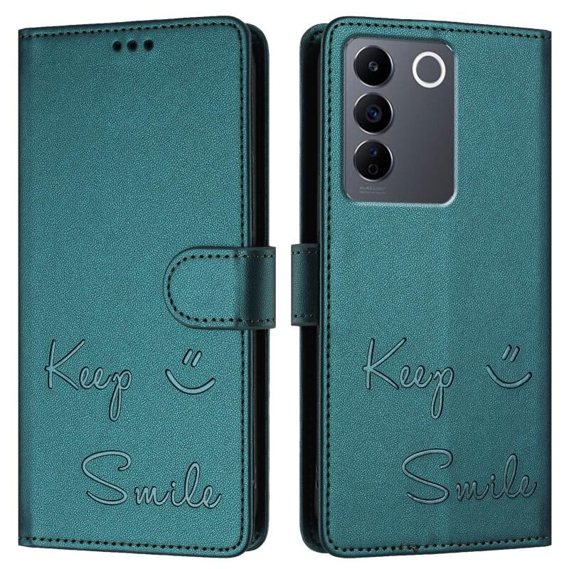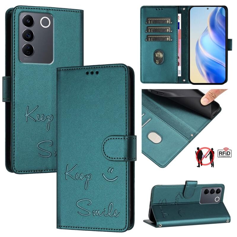 Για vivo T2 4G Παγκόσμια χαμόγελο ανάγλυφο RFID δερμάτινη θήκη τηλεφώνου (Peacock Green)