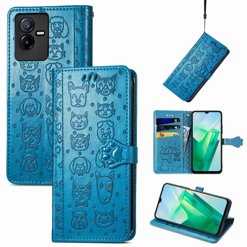 Θήκη τηλεφώνου από δέρμα με ανάγλυφα σχέδια χαριτωμένων γάτας και σκύλου για vivo T2X (Μωβ)
