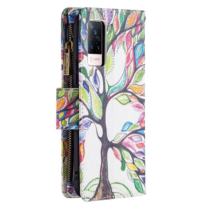 Θήκη δέρματος οριζόντιας αναδίπλωσης με φερμουάρ για vivo V21 με σχέδιο έγχρωμης ζωγραφικής, με βάση & υποδοχές καρτών & πορτοφόλι (Μεγάλο Δέντρο)