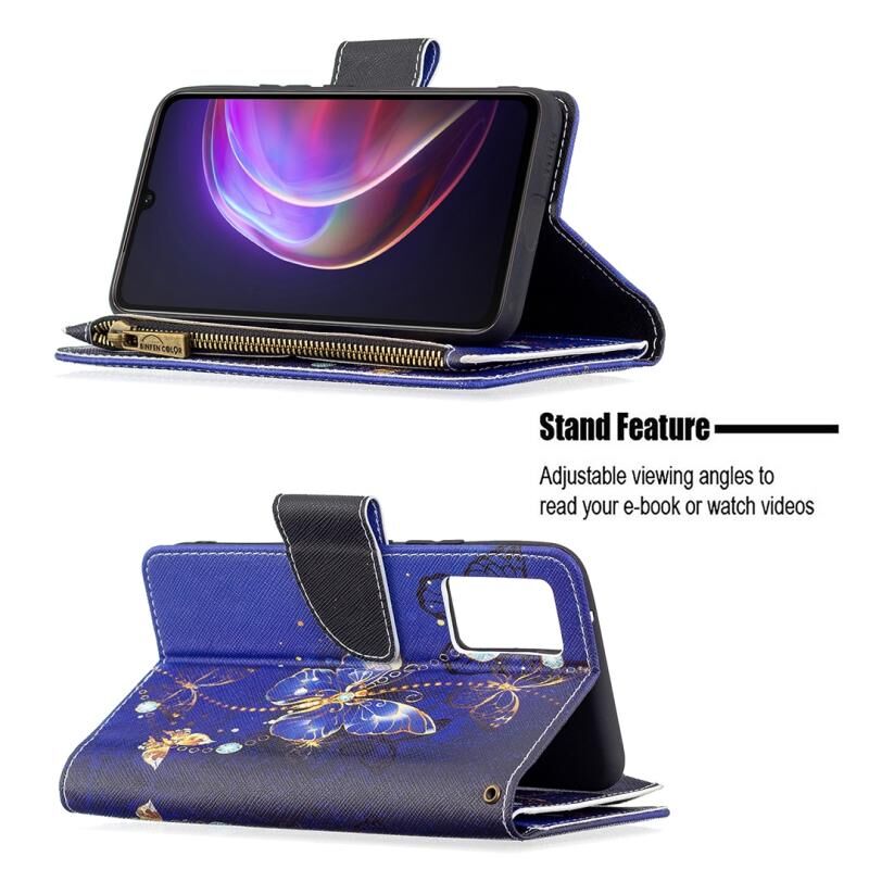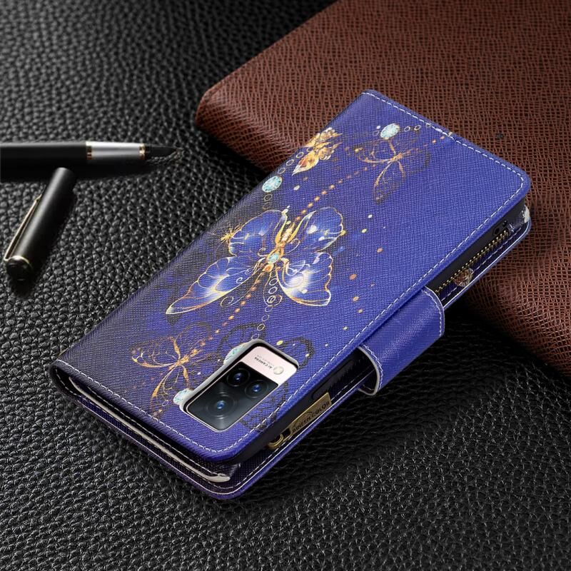 Θήκη δέρματος οριζόντιας αναδίπλωσης με φερμουάρ για vivo V21 με σχέδιο έγχρωμης ζωγραφικής, με βάση & υποδοχές καρτών & πορτοφόλι (Μωβ Πεταλούδα)