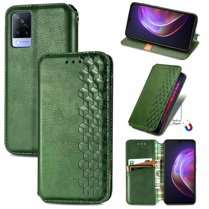 Για το vivo V21 Cubic Grid Pressed Horizontal Flip Μαγνητική PU δερμάτινη θήκη με θήκη για κάρτες & υποδοχές & πορτοφόλι (πράσινο)