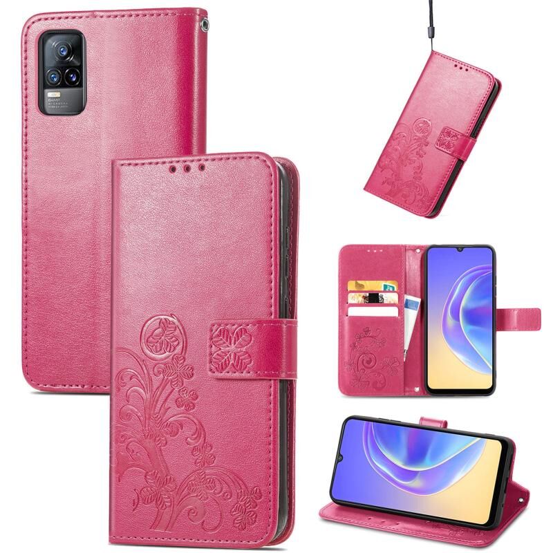 Για το vivo V21e 4G Four-leaf Clasp ανάγλυφη αγκράφα Κινητό τηλέφωνο Προστασία Δερμάτινη θήκη με κορδόνι & υποδοχή κάρτας & πορτοφόλι & λειτουργία βραχίονα (Magenta)