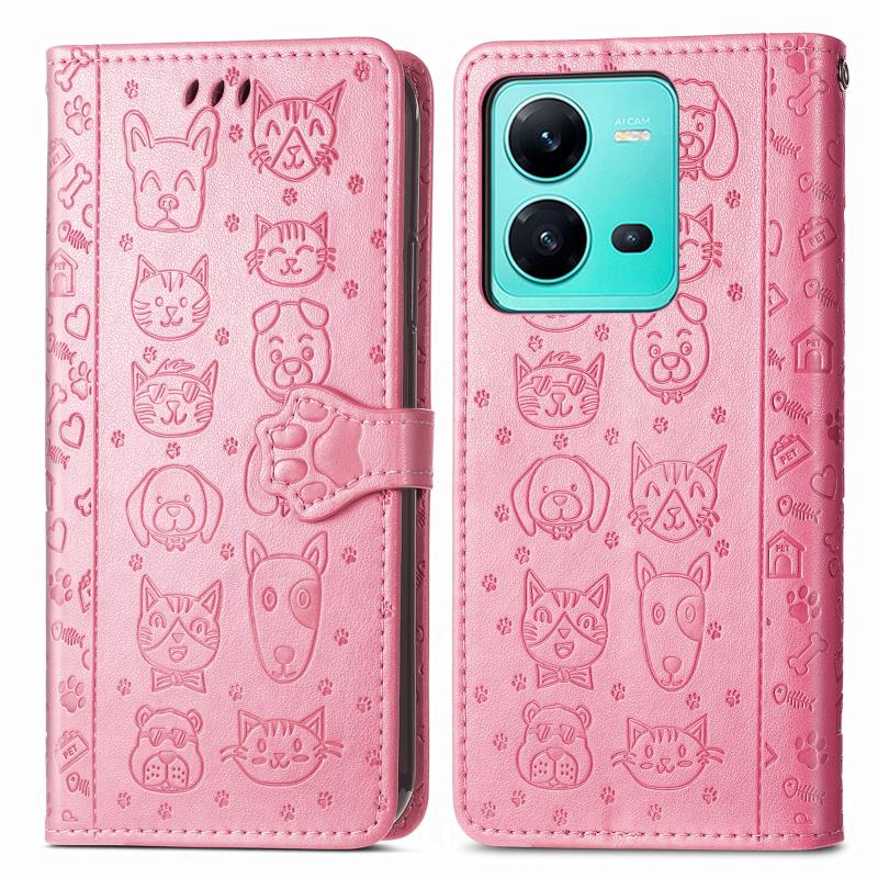 For vivo V25 Cute Cat and Dog Embossed Leather Phone Case(Pink)