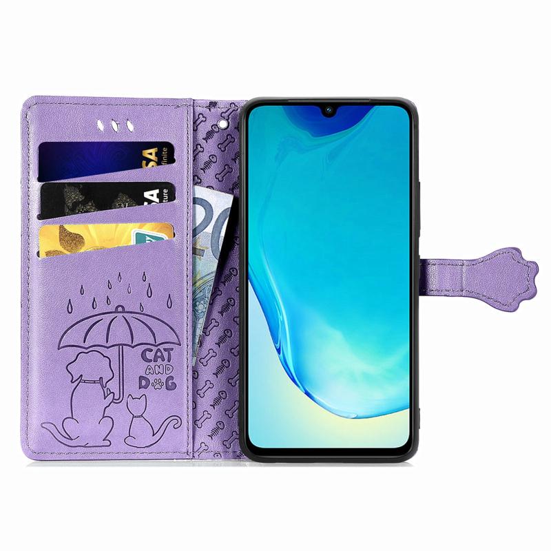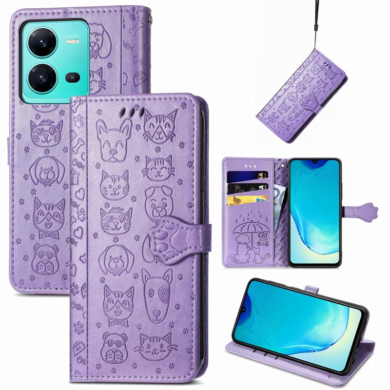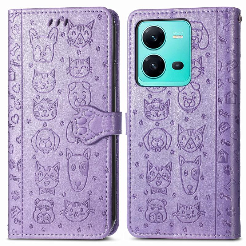 For vivo V25 Cute Cat and Dog Embossed Leather Phone Case(Purple)