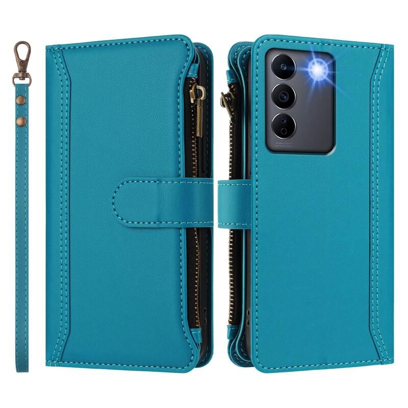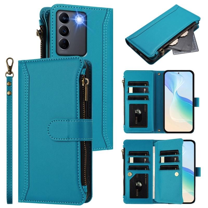 Για vivo V27 5G Global / V27 Pro 5G Global Μαγνητικό Κλείσιμο 9 Θήκες Κάρτας Δερμάτινη Θήκη με Φερμουάρ και Λουρί Χεριού (Τουρκουάζ)