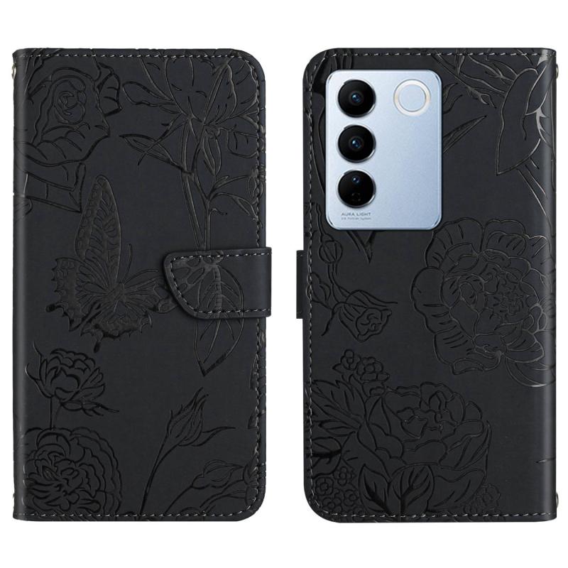 For vivo V27 HT03 Skin Feel Butterfly Embossed Flip Leather Phone Case(Black)