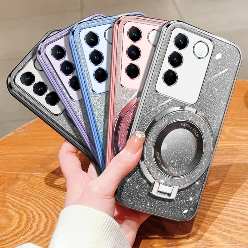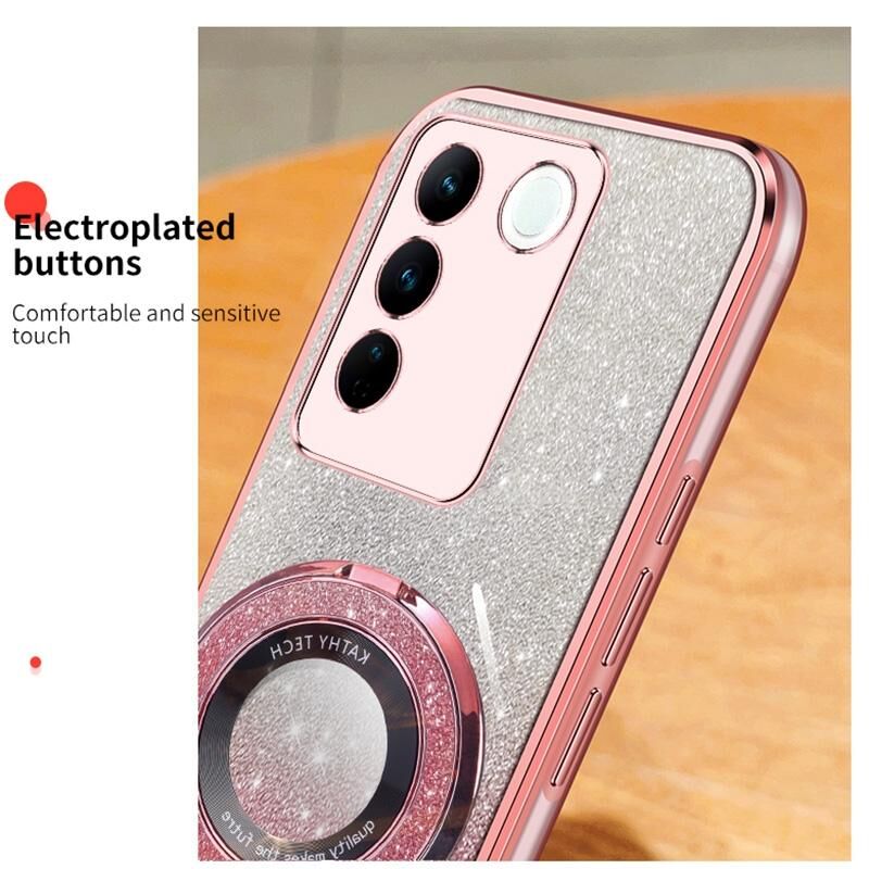 Θήκη τηλεφώνου TPU με στρογγυλό στήριγμα, γυαλιστερό διαφανές σχέδιο με μεταλλική λάμψη για vivo V27 / V27 Pro (Ροζ)