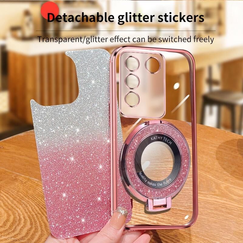 Θήκη τηλεφώνου TPU με στρογγυλό στήριγμα, γυαλιστερό διαφανές σχέδιο με μεταλλική λάμψη για vivo V27 / V27 Pro (Ροζ)