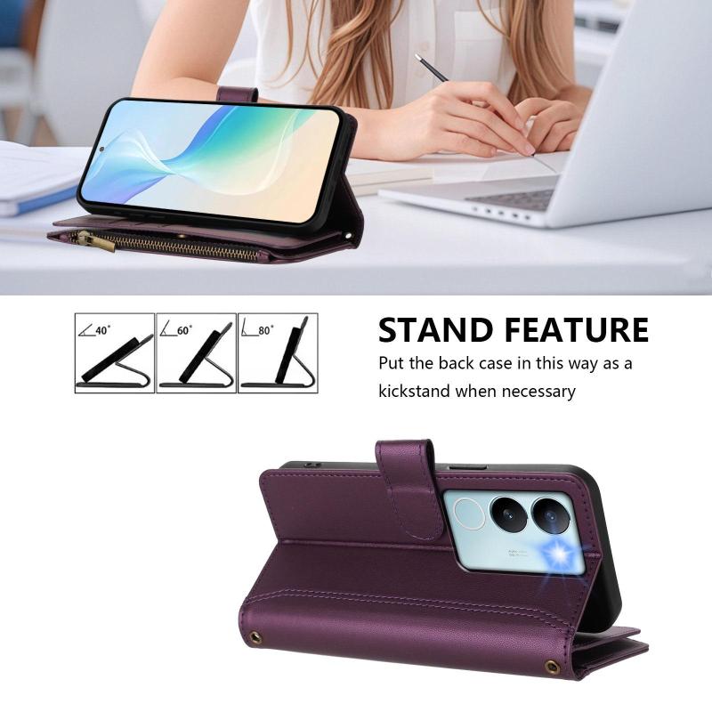 For vivo V29 5G Global Magnetic Closure 9 Card Slots Zipper Leather Case with Hand Strap(Purple)