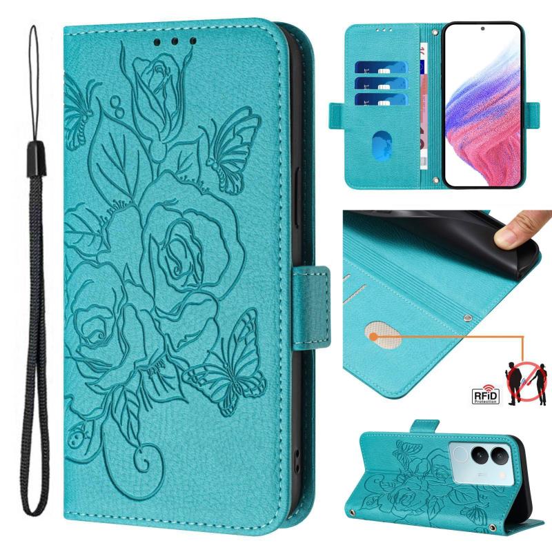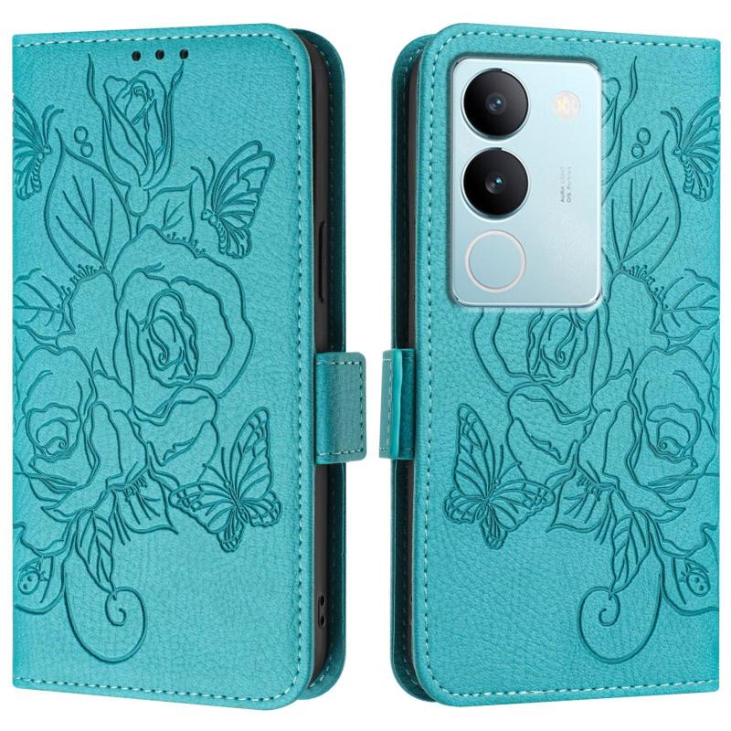 Θήκη τηλεφώνου από δέρμα με ανάγλυφο σχέδιο τριαντάφυλλου και προστασία RFID κατά της κλοπής για vivo V29 5G Global / V29 Pro (Πράσινο)