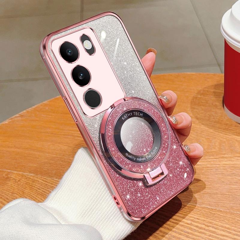 For vivo V29 / V29 Pro Plated Gradient Glitter Round Holder TPU Phone Case(Pink)