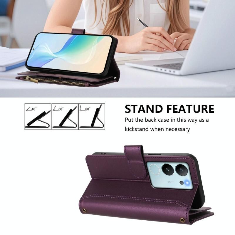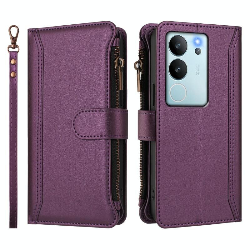 Για vivo V29E 5G Global / V30 Lite 5G Global Μαγνητικό Κλείσιμο 9 Θήκες Κάρτας Δερμάτινη Θήκη με Φερμουάρ και Λουρί Χεριού (Σκούρο Μπλε)