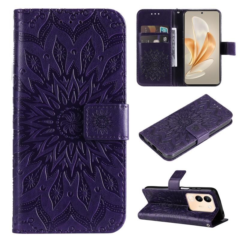 Για vivo V29e Παγκόσμια / Y200 5G Παγκόσμια ανάγλυφο ηλιοτρόπιο μοτίβο Flip δέρμα τηλέφωνο υπόθεση (Μωβ)