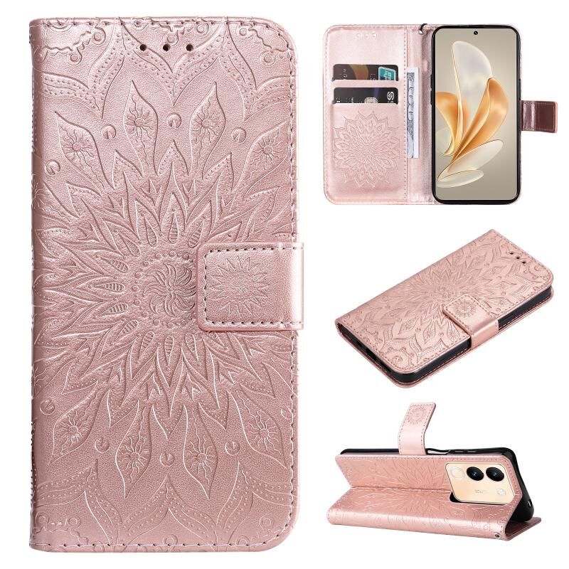 Για vivo V29e Παγκόσμια / Y200 5G Παγκόσμια ανάγλυφο ηλιοτρόπιο μοτίβο Flip δέρμα τηλέφωνο υπόθεση (Rose Gold)