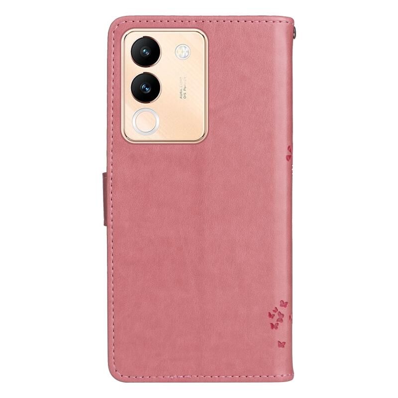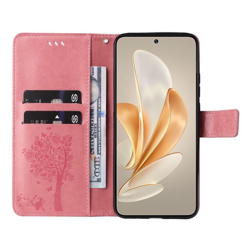 Για το vivo V29e Global / Y200 5G Global Tree & Cat ανάγλυφο μοτίβο Flip δερμάτινη θήκη τηλεφώνου (ρόζ)