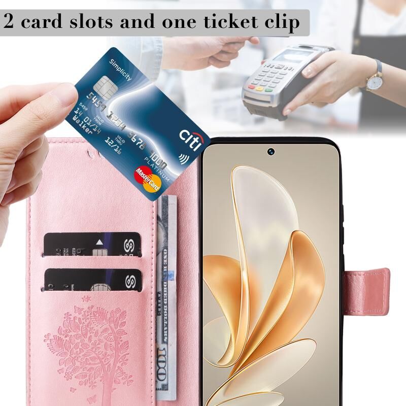 Για το vivo V29e Global / Y200 5G Global Tree & Cat ανάγλυφο μοτίβο Flip δερμάτινη θήκη τηλεφώνου (Rose Gold)