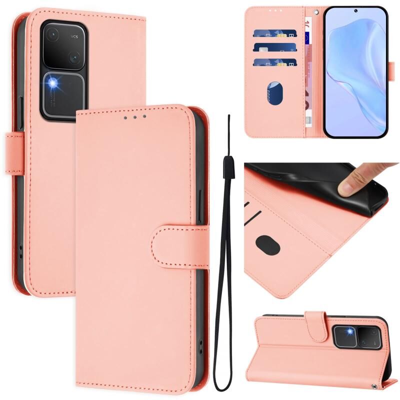 Θήκη τηλεφώνου από δέρμα με συμπαγή χρώματα και αίσθηση δέρματος για vivo V30 5G Global / V30 Pro Global με κορδόνι (Καφέ)