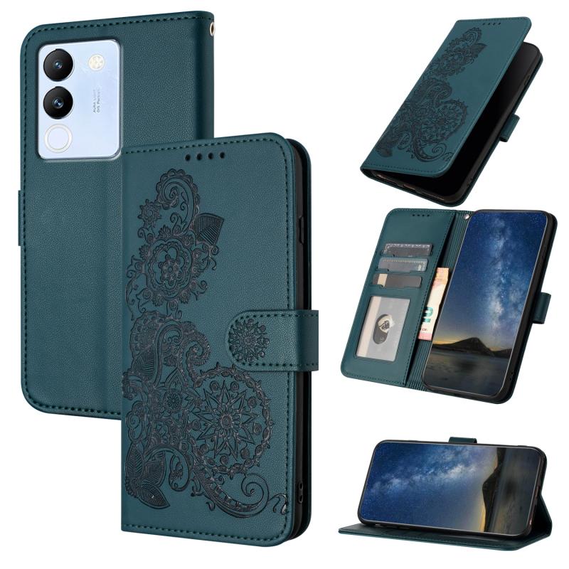 For vivo V30 Lite 5G Global Datura Flower Embossed Flip Leather Phone Case(Dark Green)