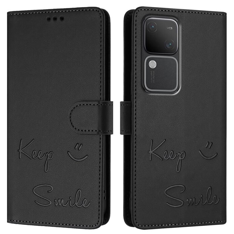 Για vivo V30 Pro 5G Παγκόσμια χαμόγελο ανάγλυφο RFID δερμάτινη θήκη τηλεφώνου (Μαύρο)