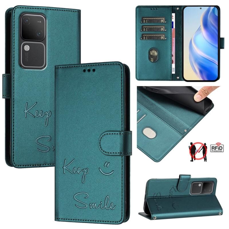 Για vivo V30 Pro 5G Παγκόσμια χαμόγελο ανάγλυφο RFID δερμάτινη θήκη τηλεφώνου (Πράσινο παγώνι)