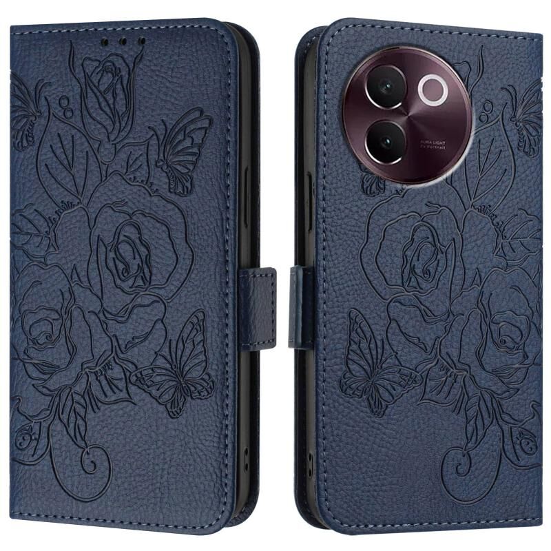 Θήκη τηλεφώνου δερμάτινη με ανάγλυφο σχέδιο τριαντάφυλλου και προστασία RFID για vivo V30e Global (Πράσινη)