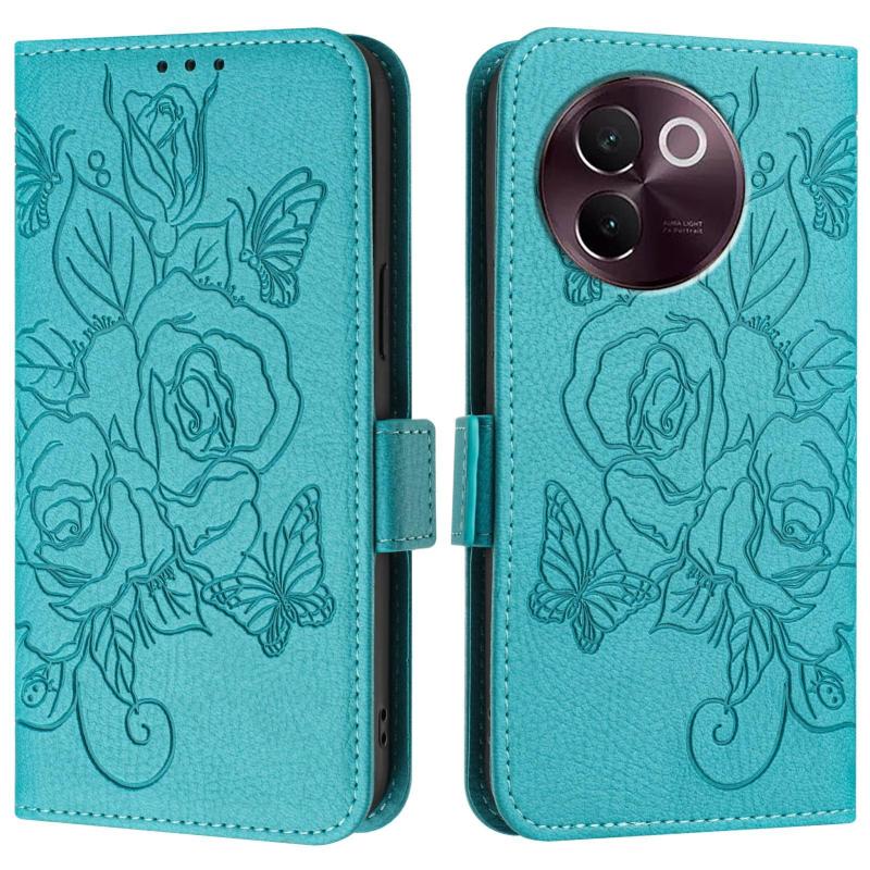 Θήκη τηλεφώνου δερμάτινη με ανάγλυφο σχέδιο τριαντάφυλλου και προστασία RFID για vivo V30e Global (Πράσινη)