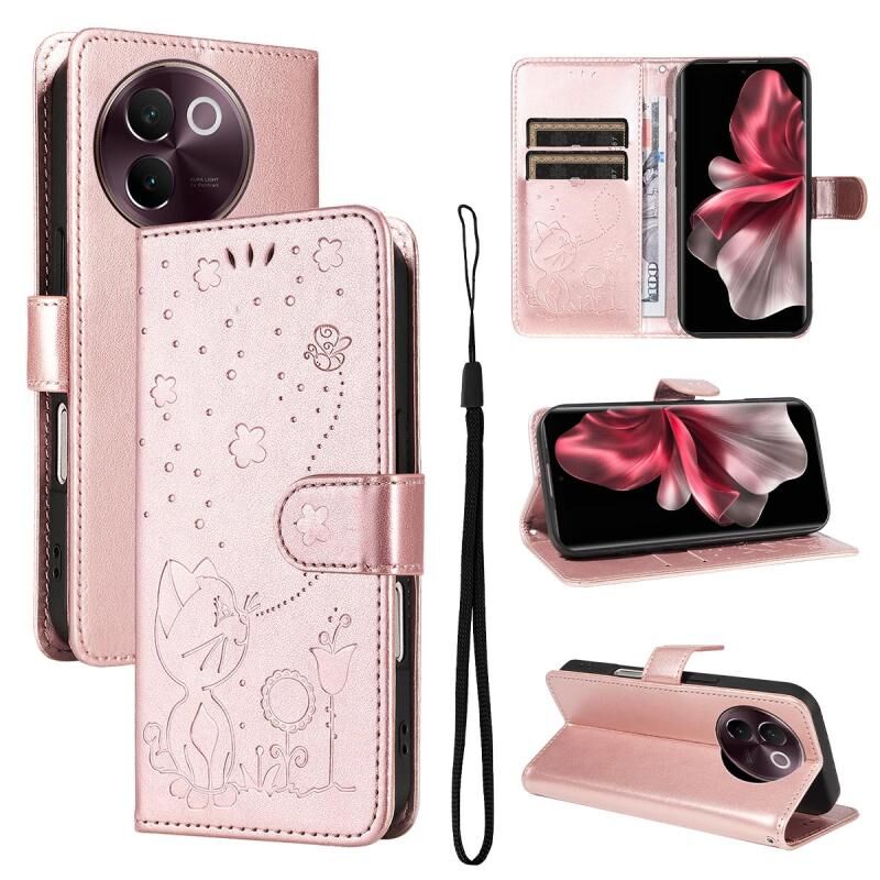 Θήκη τηλεφώνου από δέρμα με ανάγλυφο σχέδιο γάτας και μέλισσας για vivo V30E / V40 Lite Global (Κόκκινο)