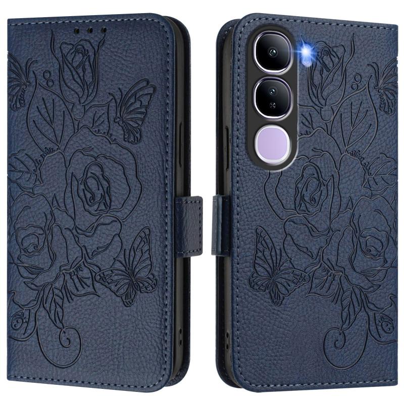 For vivo V40 Lite 5G IDN Embossed Rose RFID Anti-theft Leather Phone Case(Dark Blue)