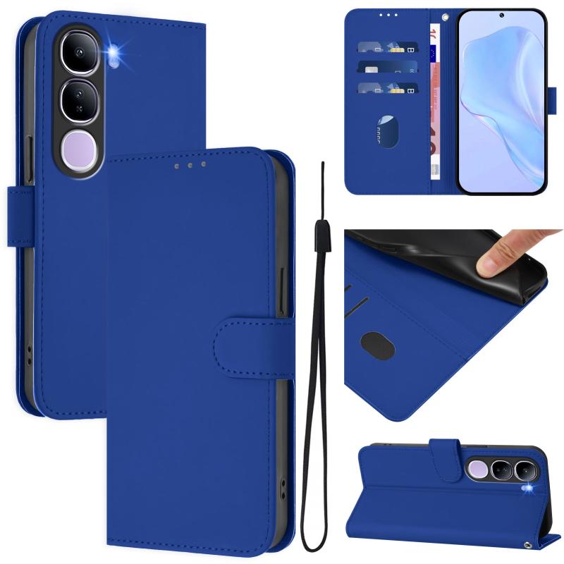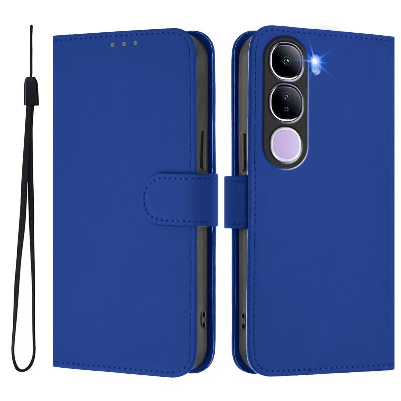 For vivo V40 Lite 5G IDN Skin Feel Solid Color Leather Phone Case with Lanyard(Dark Blue)