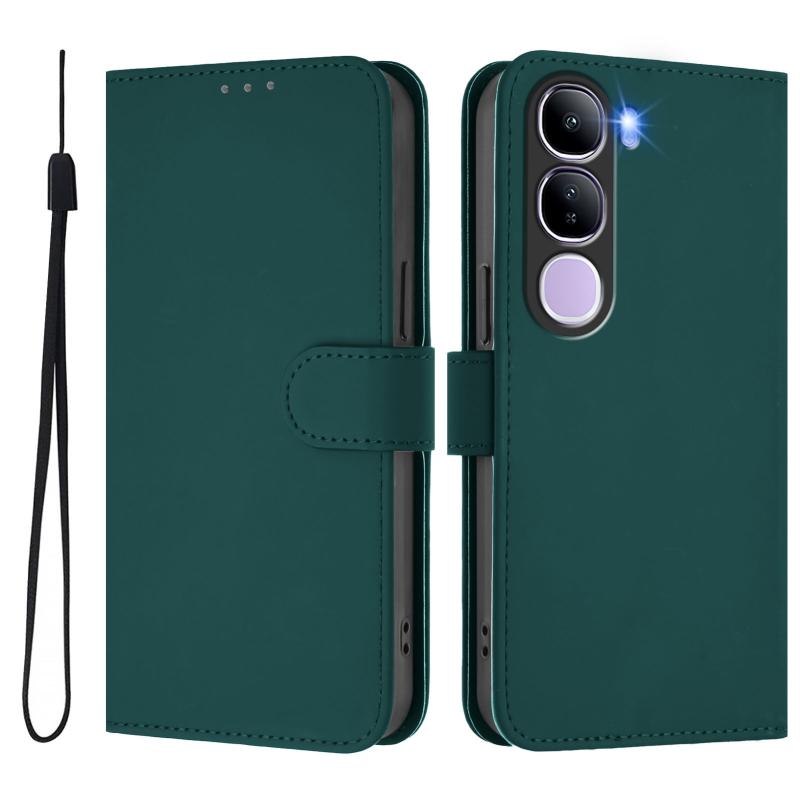 Θήκη τηλεφώνου από δέρμα με συμπαγή χρώμα για vivo V40 Lite 5G με αίσθηση IDN και λουρί (Σκούρο πράσινο)
