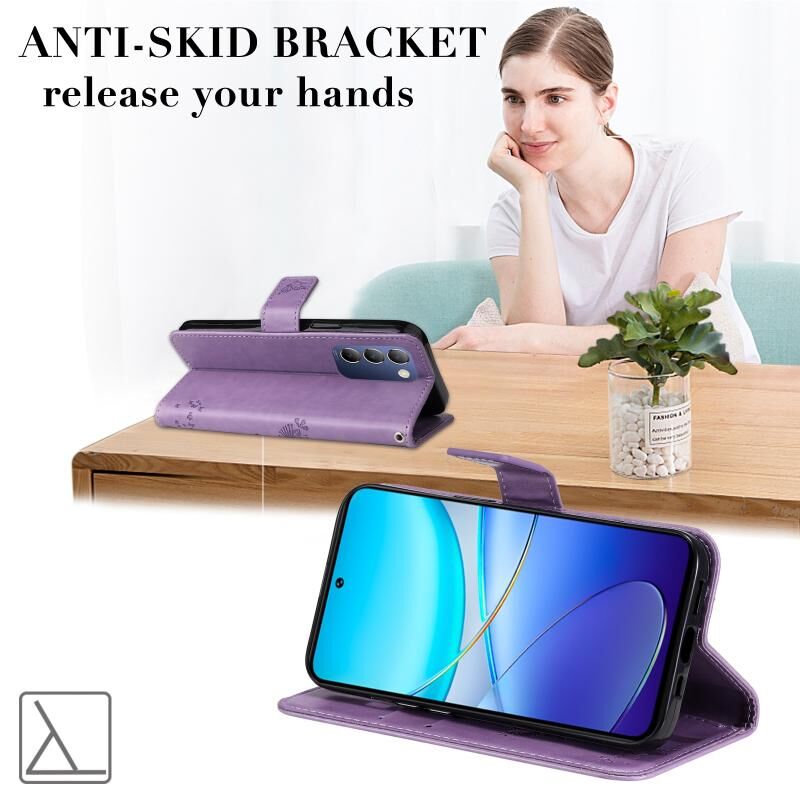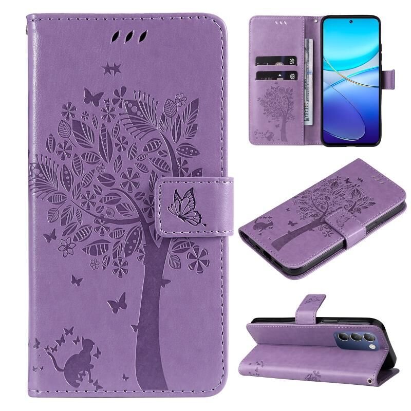 Για το vivo V40 SE 5G / Y100 IDN Tree & Cat ανάγλυφο μοτίβο Flip δερμάτινη θήκη τηλεφώνου (Light Purple)