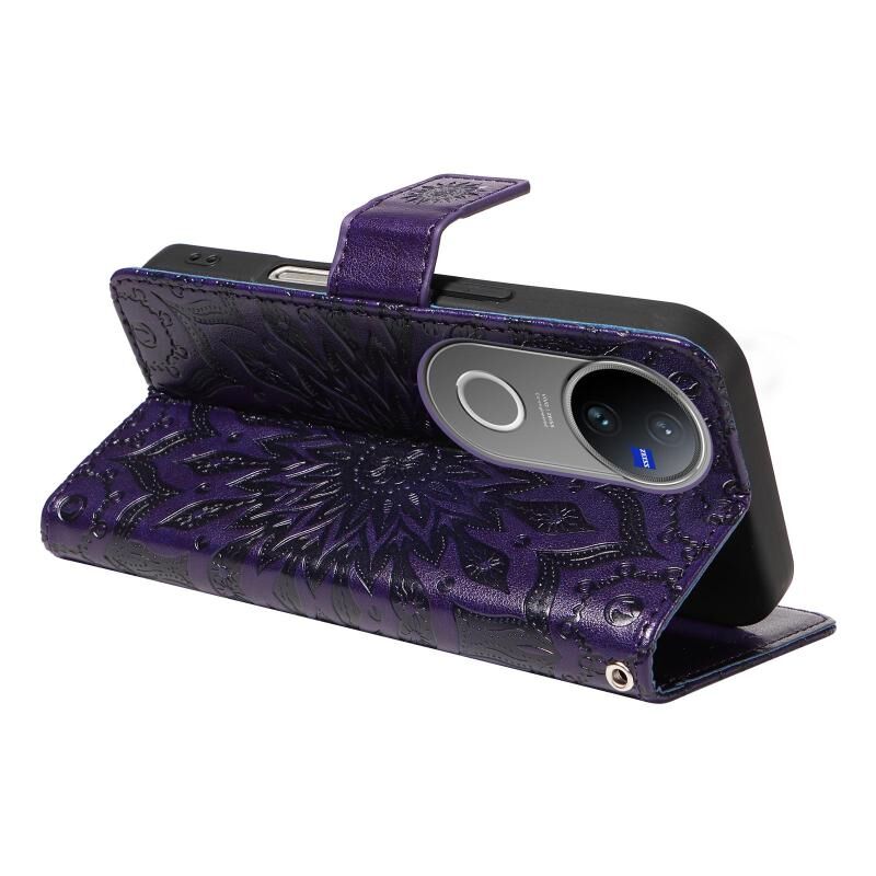 Θήκη τηλεφώνου από δέρμα με σχέδιο ηλιοτροπίου σε ανάγλυφο για vivo V50 5G (Μωβ)