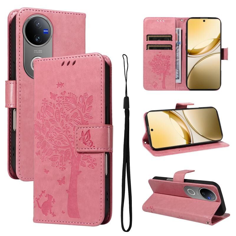 Θήκη τηλεφώνου από δέρμα με σχέδιο ανάγλυφου δέντρου & γάτας για vivo V50 5G (ρόζ)