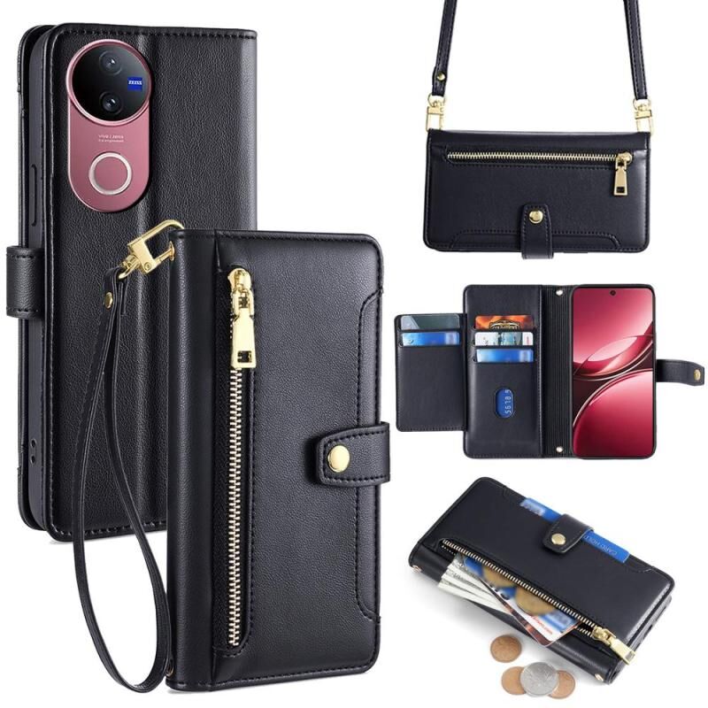 Θήκη τηλεφώνου δερμάτινη με υφή προβάτου, διαγώνια, με φερμουάρ και θήκη πορτοφολιού για vivo V50 5G (Μαύρο)