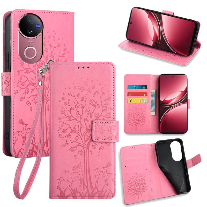 For vivo V50 5G Tree & Deer Embossed Leather Phone Case(Pink)
