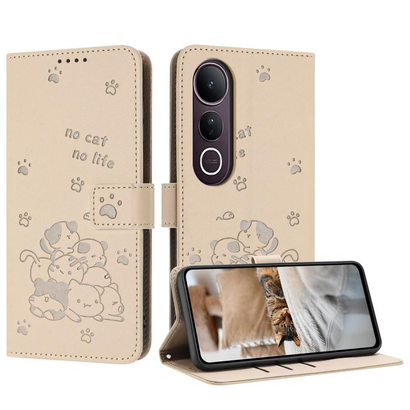 For vivo V50 Lite Embossed Kitten Phone Leather Case with Lanyard(Beige)