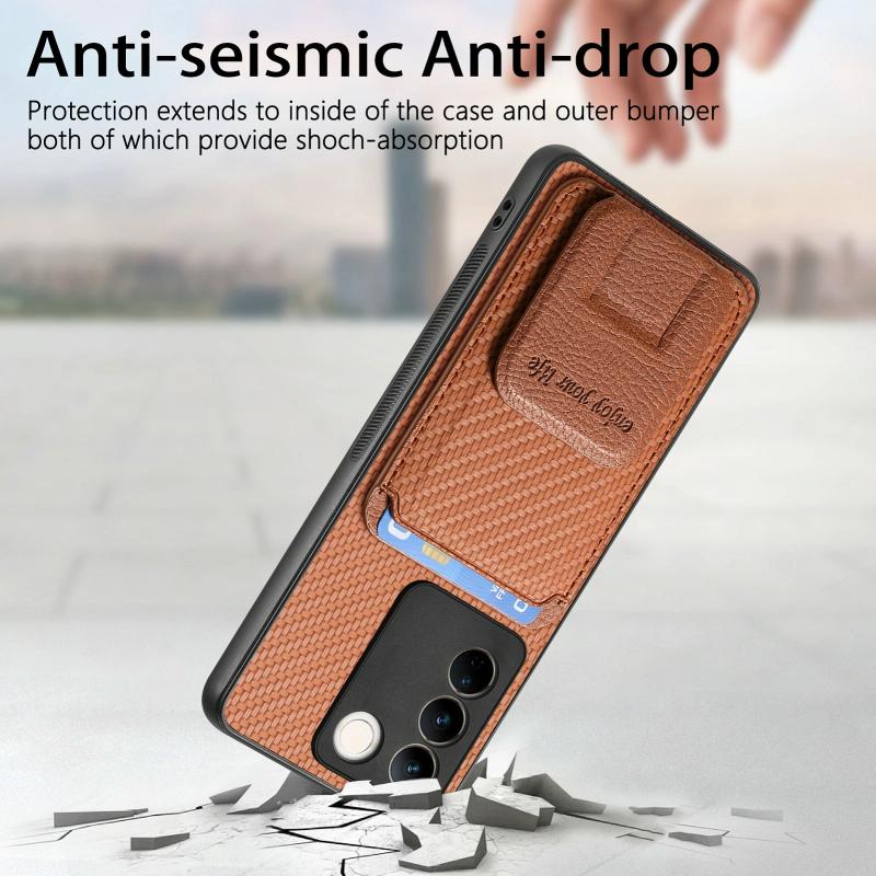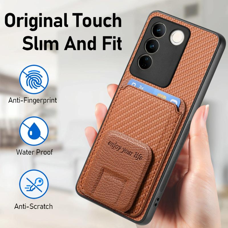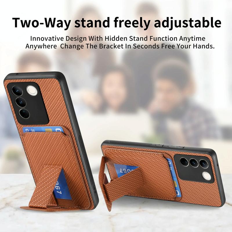 For vivo X100 5G Carbon Fiber Card Bag Fold Stand Phone Case(Brown)
