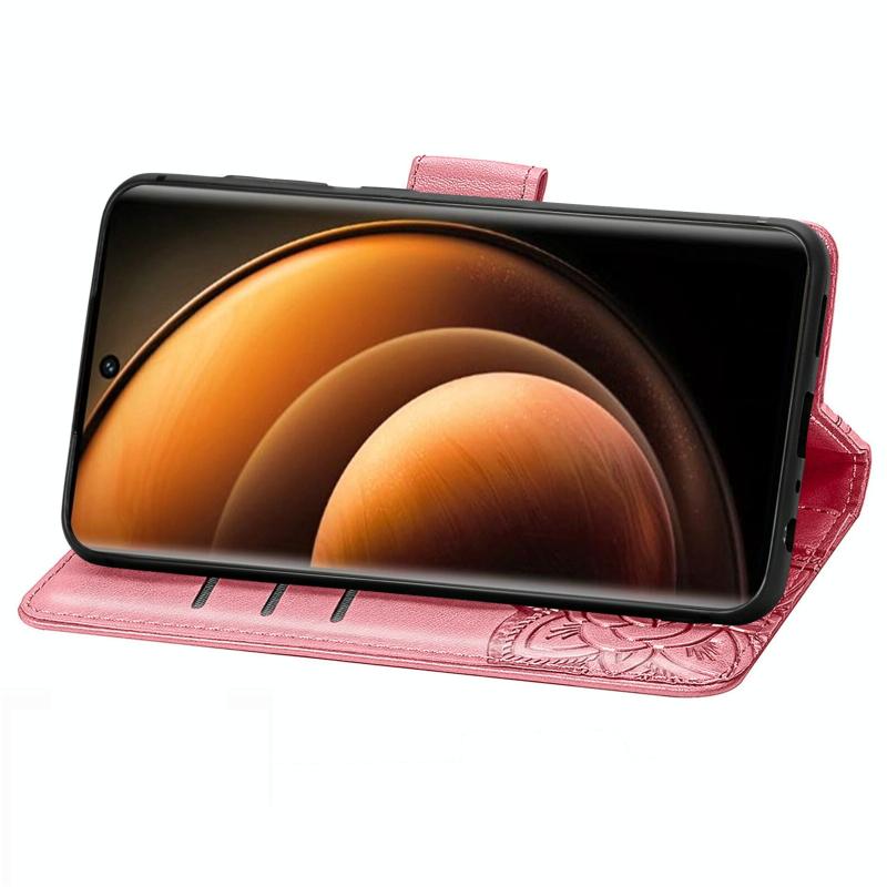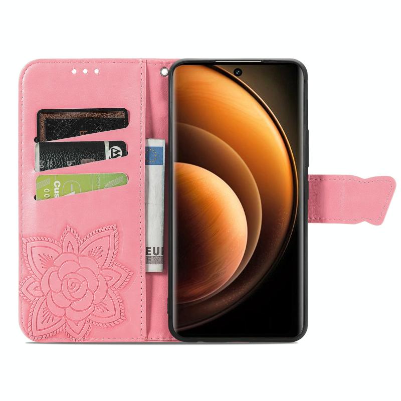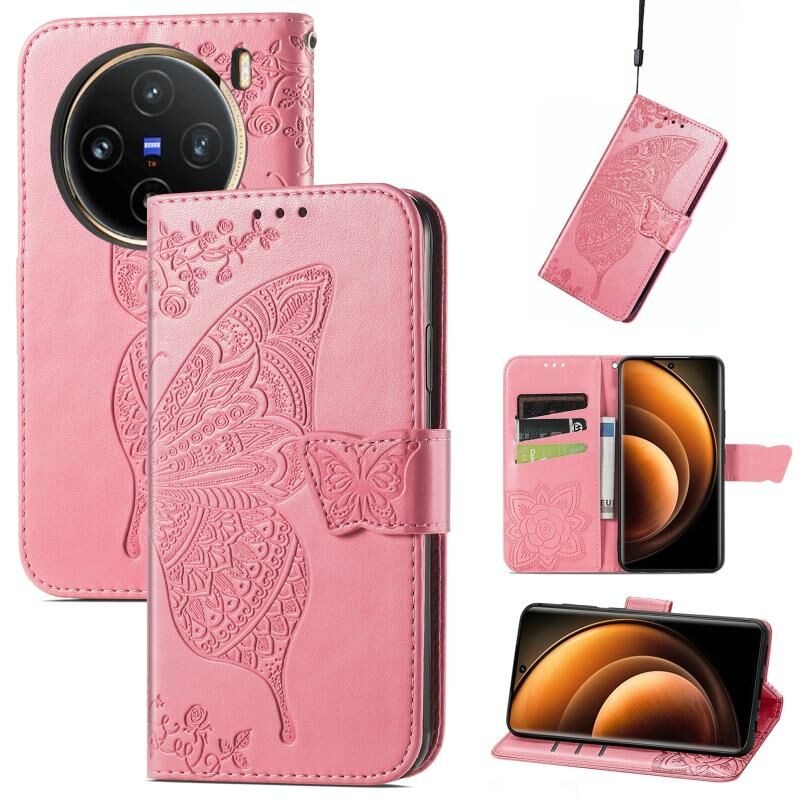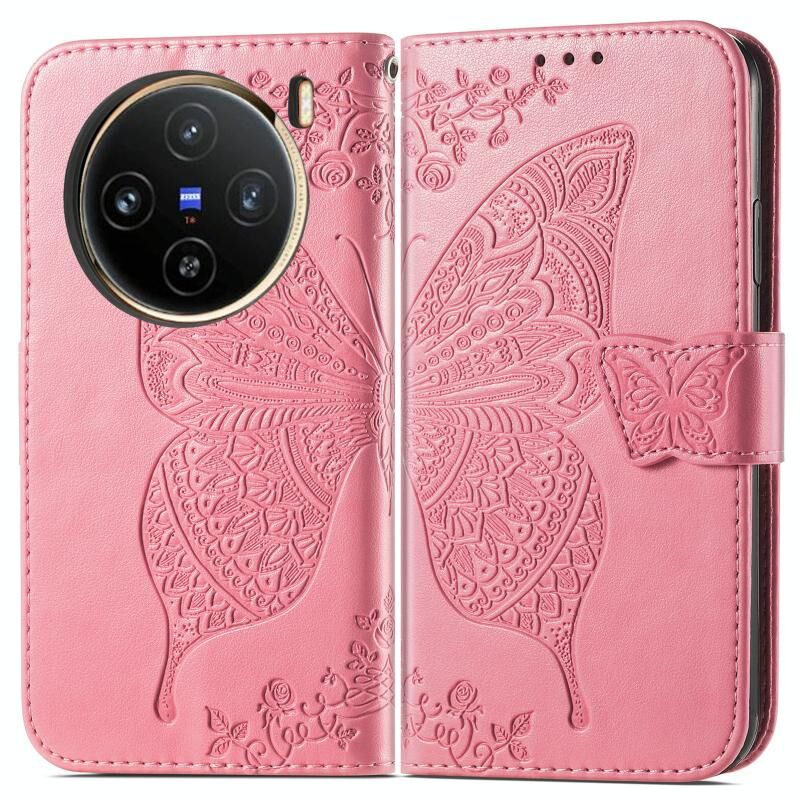Θήκη δερμάτινη με ανάγλυφο σχέδιο πεταλούδας για vivo X100 (Ροζ)