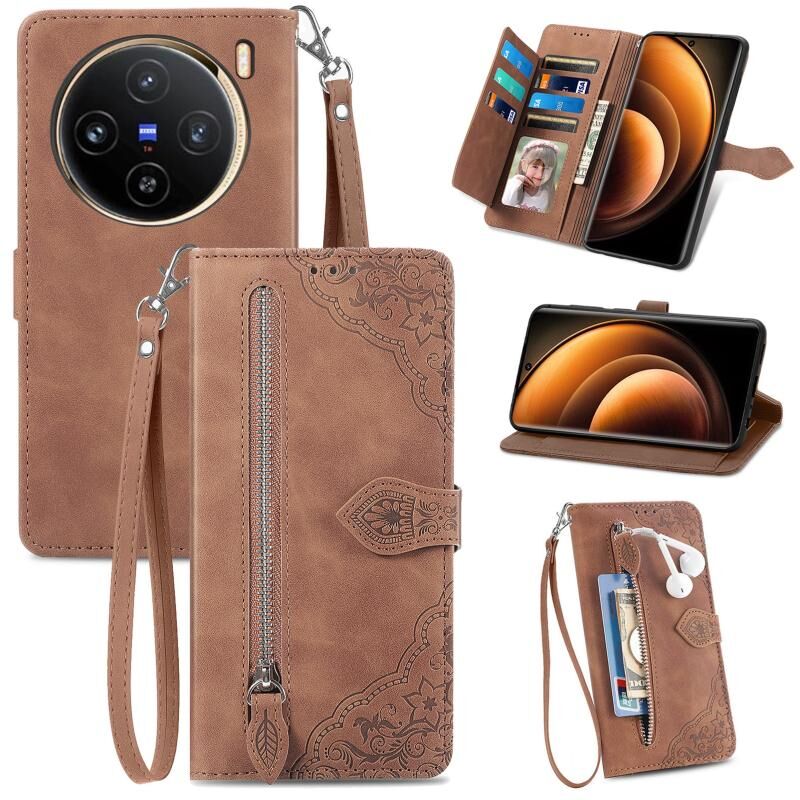 Για vivo X100 ανάγλυφο λουλούδι φερμουάρ δερμάτινη θήκη τηλεφώνου (καφέ)